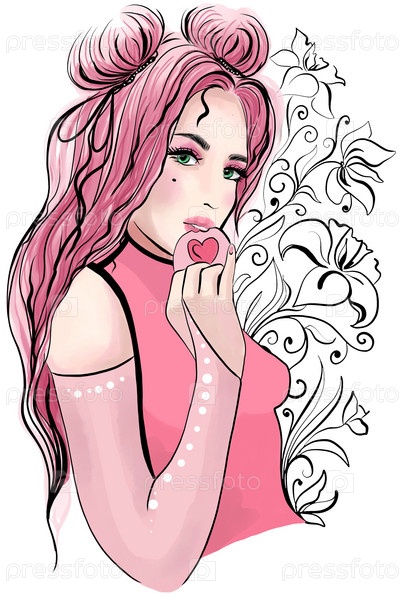 Красивая сексуальная девушка с зелеными глазами в розовом платье на цветочном фоне. Цифровая акварельная романтическая модная иллюстрация