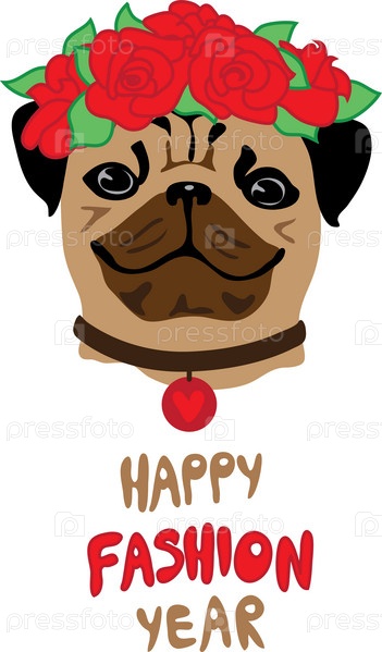 Забавный мопс с венком из роз. Концепция векторной иллюстрации моды. Животное символ 2018 года