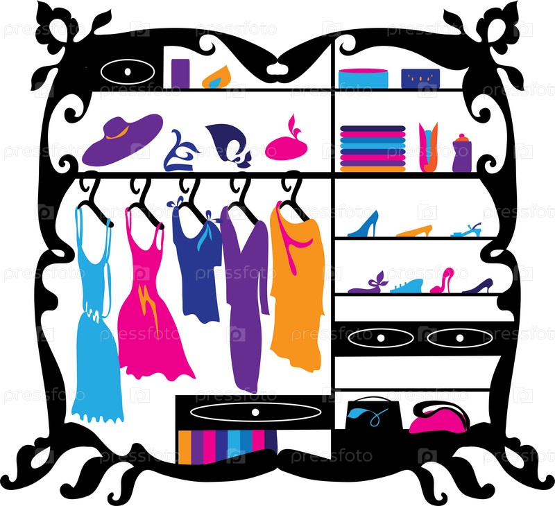 Роскошный модный гардероб изолировал векторную иллюстрацию. Силуэт интерьера торгового центра женской одежды и обуви