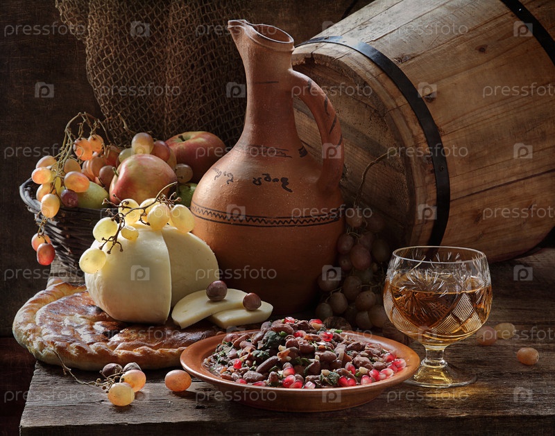 Натюрморт с вином, лобио и сыром на деревянном столе