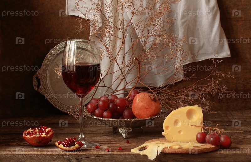 Натюрморт с вином и сыром на деревянном столе