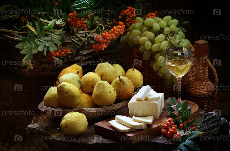 Белое вино с брынзой,грушами на деревянном столе