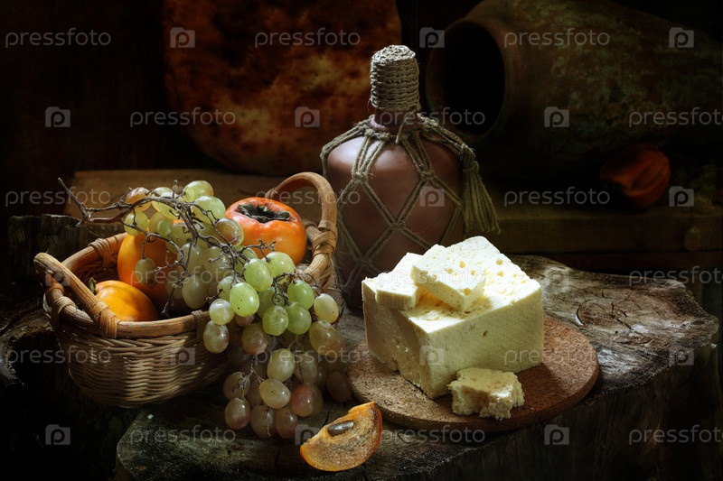 Белое вино с брынзой,хурмой на деревянном столе