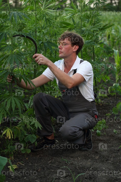 Фермер работает на конопляном поле. Срезает лишние растения серпом
