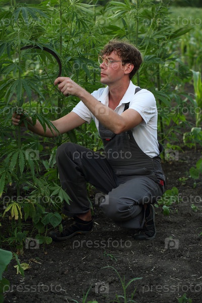 Фермер работает на конопляном поле. Срезает лишние растения серпом