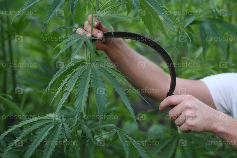 Фермер работает на конопляном поле. Срезает лишние растения серпом