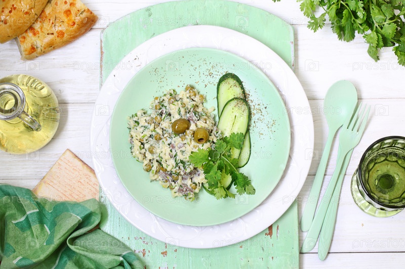 Салат из говяжьего сердца с горошком,сыром,кинзой и майонезом на белом фоне