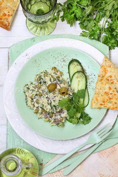 Салат из говяжьего сердца с горошком,сыром,кинзой и майонезом на белом фоне