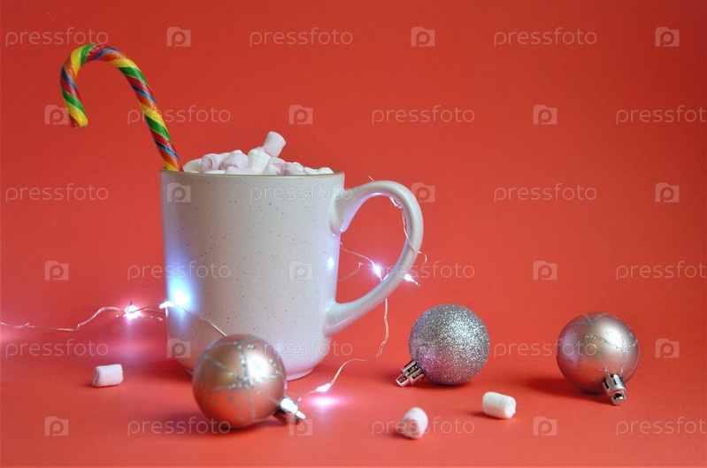 Праздничная чашка с какао и марчелоу на красном фоне с леденцовой тростью