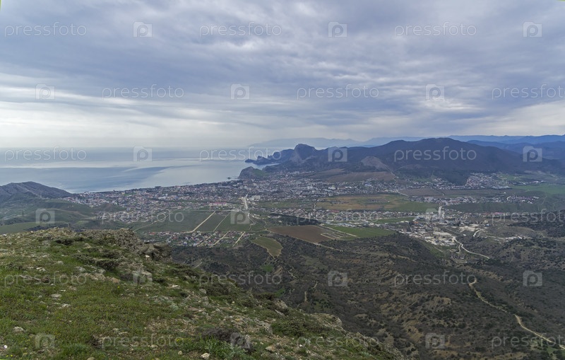 Панорама Судакской долины и курортного города Судак с вершины горы Ай-Георгий. Крым. Пасмурный день в апреле