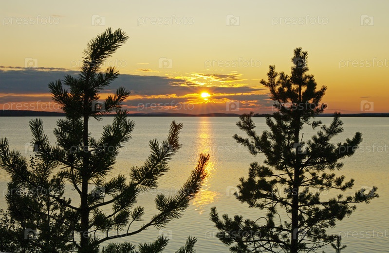 Вечер на Канозере - заходящее солнце между двух небольших сосен. Река Умба, Кольский полуостров, Мурманская область. Август