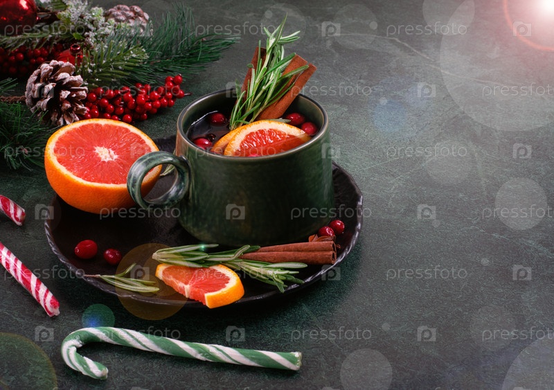 Глинтвейн подается с красным апельсином, корицей, клюквой и розмарином в зеленой керамической кружке на темном столе. Рождественский и зимний согревающий напиток