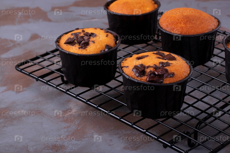 Кексы с шоколадной крошкой в бумажных стаканчиках на охлаждающей стойке. Домашний запеченный десерт
