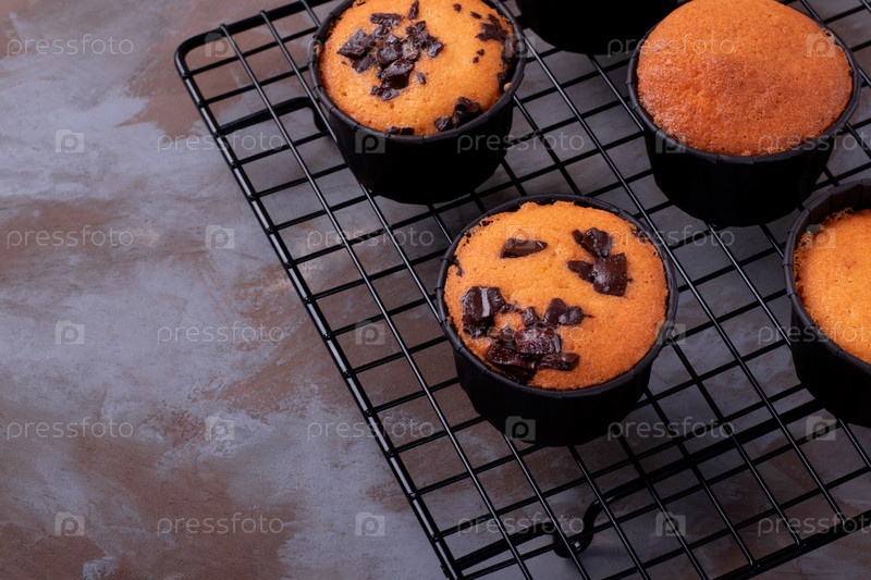 Кексы с шоколадной крошкой в бумажных стаканчиках на охлаждающей стойке. Домашний запеченный десерт