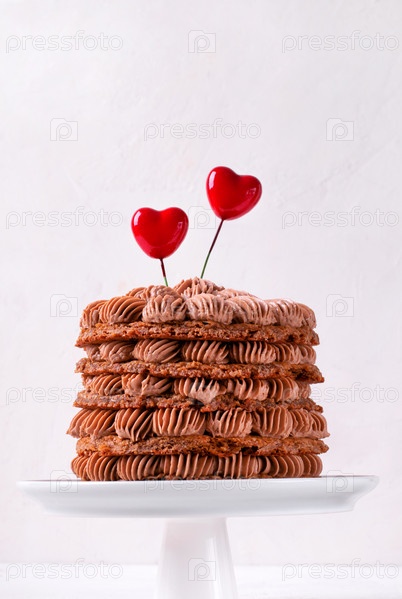 Шоколадный торт с кофейным кремом и многослойный, украшенный двумя сердечками, которые подаются на подставке для торта. Десерт ко дню святого Валентина