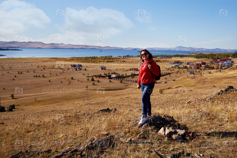 Женщина с рюкзаком путешествует по озеру Байкал ранней осенью