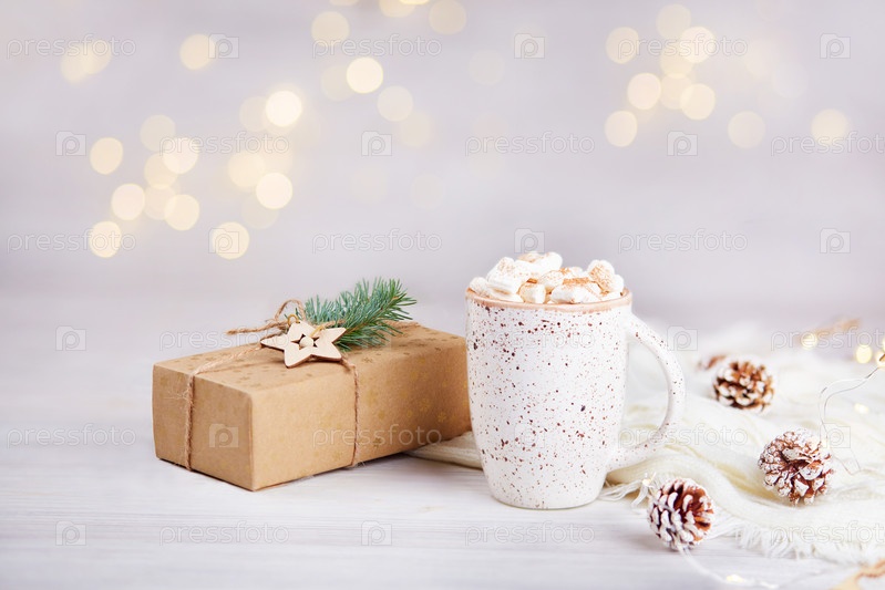 Рождественская открытка. Кружка какао или горячего шоколада с зефиром