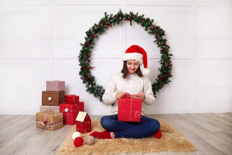 Счастливая девушка в белом вязаном свитере и шапке Санта-Клауса держит в руках подарочную коробку
