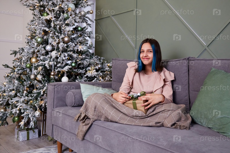 Счастливая девушка сидит над диваном, укрывшись теплым пледом. В руках подарочная коробка