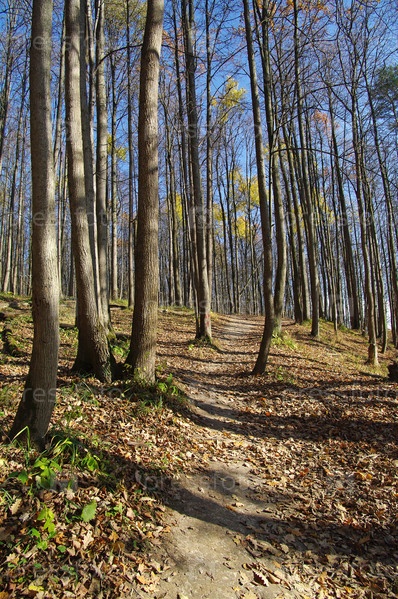 Солнечный день в осеннем лесу. Тропинка, спускающаяся по склону оврага. Середина октября. Битцевский лес, Москва