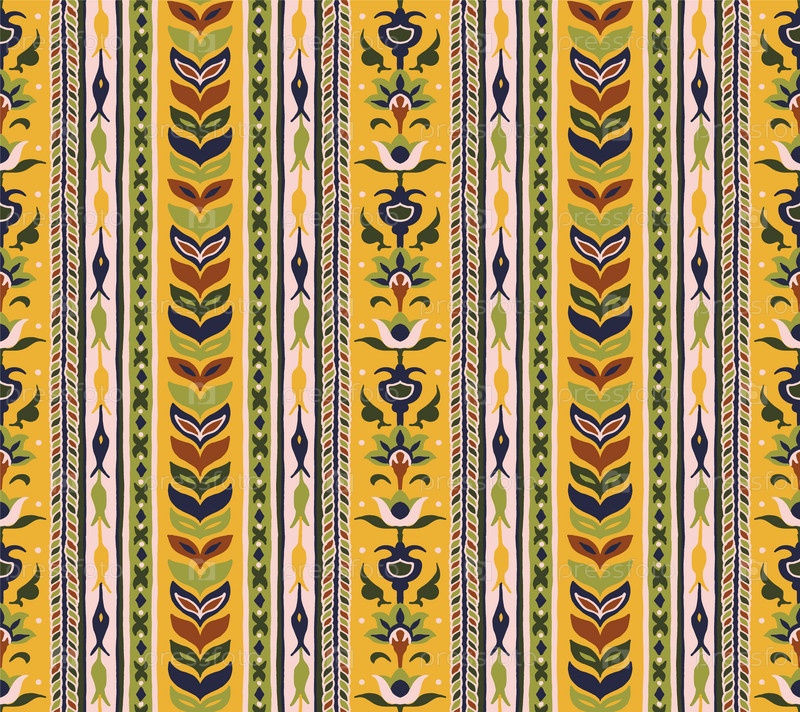 Геометрический дамасский орнамент. Икат границы. Этническая вышивка с листьями и монограммами. Племенная векторная текстура. Бесшовный народный узор в ацтекском стиле. Индийский, скандинавский, цыганский, мексиканский, африканский ковер