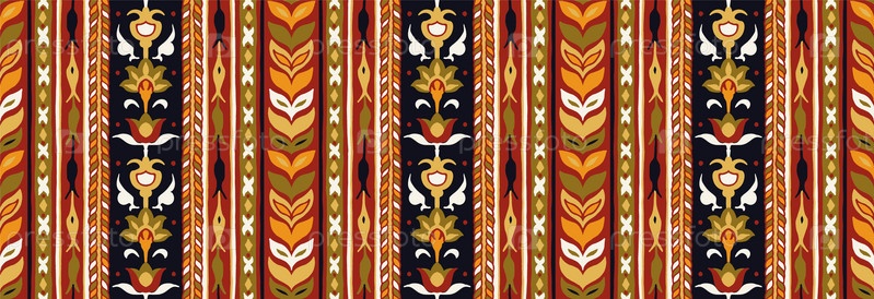 Геометрический дамасский орнамент. Икат границы. Этническая вышивка с листьями и монограммами. Племенная векторная текстура. Бесшовный народный узор в ацтекском стиле. Индийский, скандинавский, цыганский, мексиканский, африканский ковер