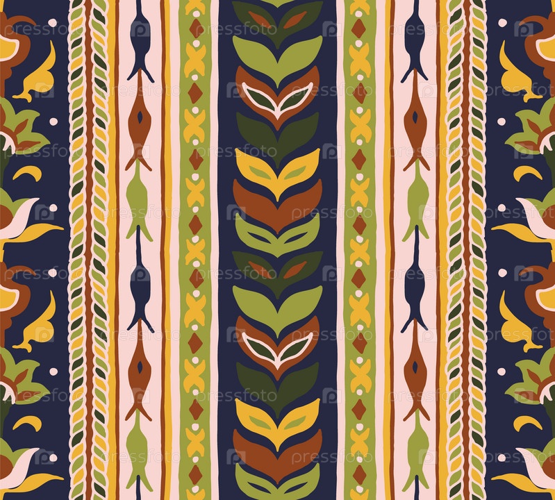Геометрический дамасский орнамент. Икат границы. Этническая вышивка с листьями и монограммами. Племенная векторная текстура. Бесшовный народный узор в ацтекском стиле. Индийский, скандинавский, цыганский, мексиканский, африканский ковер