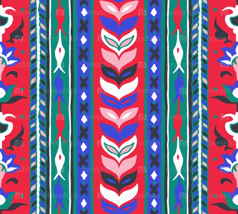 Геометрический дамасский орнамент. Икат границы. Этническая вышивка с листьями и монограммами. Племенная векторная текстура. Бесшовный народный узор в ацтекском стиле. Индийский, скандинавский, цыганский, мексиканский, африканский ковер