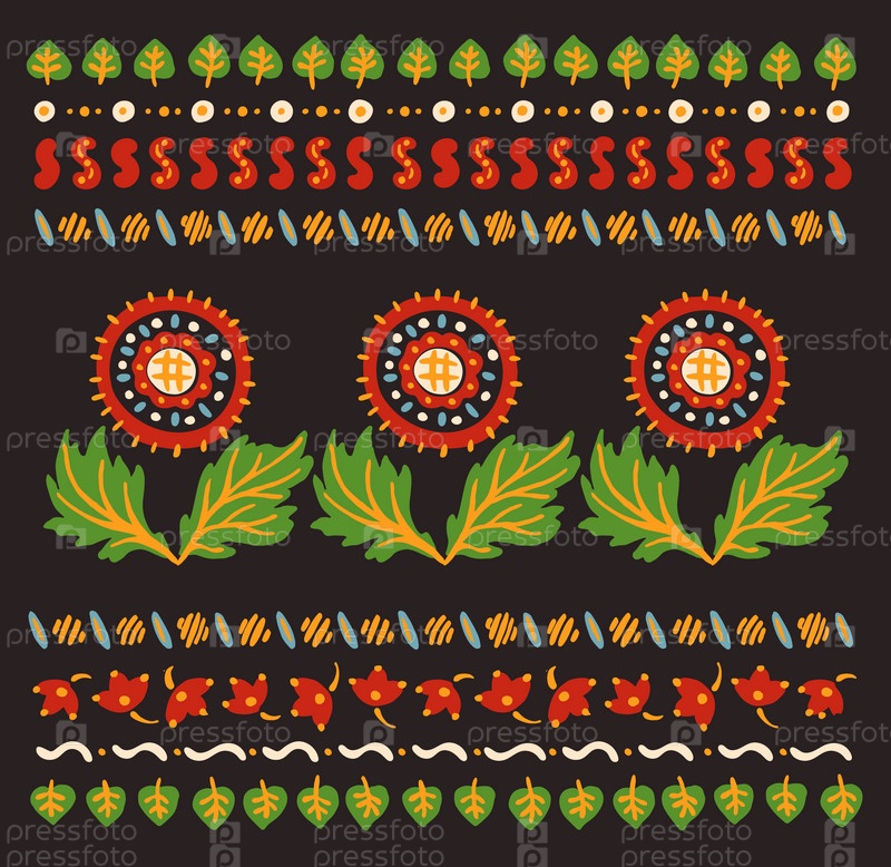 Набор этнических элементов. Бордюр представляет собой полосу с цветами, листьями, ветками, вензелями. Народная вышивка. Славянский, украинский, русский мотив. Хохлома, матрешка, дымковская игрушка. Мексиканский, индийский, цыганский ковер. Вязаное кружево