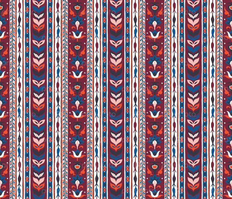 Геометрический дамасский орнамент. Икат границы. Этническая вышивка с листьями и монограммами. Племенная векторная текстура. Бесшовный народный узор в ацтекском стиле. Индийский, скандинавский, цыганский, мексиканский, африканский ковер