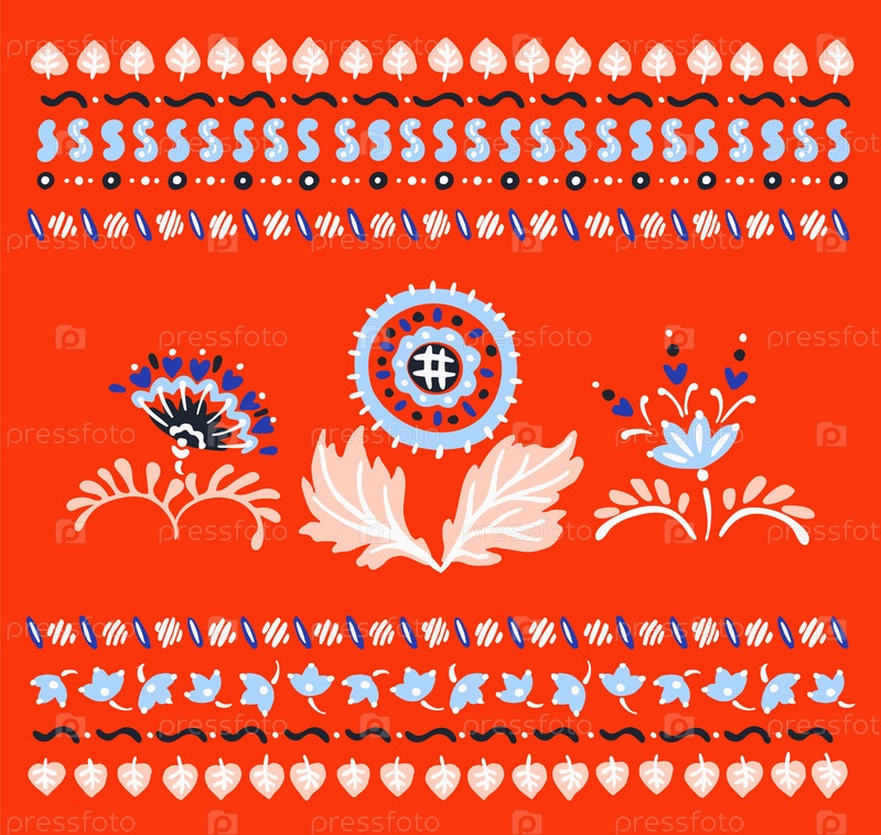 Набор этнических элементов. Бордюр представляет собой полосу с цветами, листьями, ветками, вензелями. Народная вышивка. Славянский, украинский, русский мотив. Хохлома, матрешка, дымковская игрушка. Мексиканский, индийский, цыганский ковер. Вязаное кружево