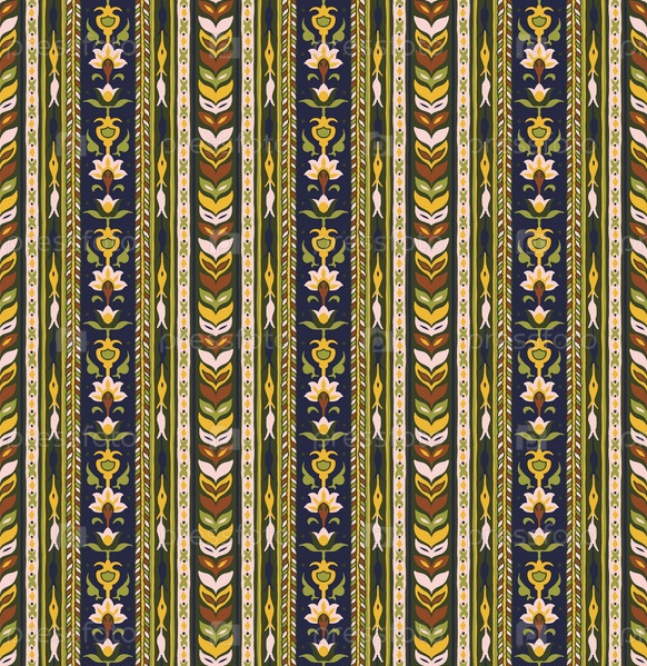 Геометрический дамасский орнамент. Икат границы. Этническая вышивка с листьями и монограммами. Племенная векторная текстура. Бесшовный народный узор в ацтекском стиле. Индийский, скандинавский, цыганский, мексиканский, африканский ковер