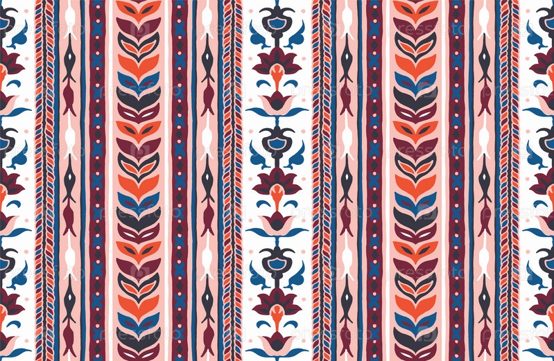 Геометрический дамасский орнамент. Икат границы. Этническая вышивка с листьями и монограммами. Племенная векторная текстура. Бесшовный народный узор в ацтекском стиле. Индийский, скандинавский, цыганский, мексиканский, африканский ковер