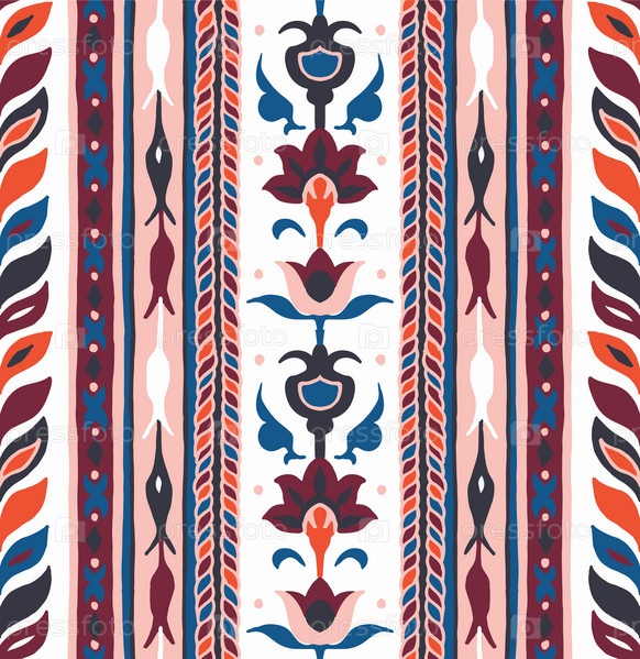 Геометрический дамасский орнамент. Икат границы. Этническая вышивка с листьями и монограммами. Племенная векторная текстура. Бесшовный народный узор в ацтекском стиле. Индийский, скандинавский, цыганский, мексиканский, африканский ковер