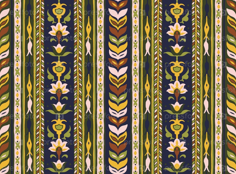 Геометрический дамасский орнамент. Икат границы. Этническая вышивка с листьями и монограммами. Племенная векторная текстура. Бесшовный народный узор в ацтекском стиле. Индийский, скандинавский, цыганский, мексиканский, африканский ковер