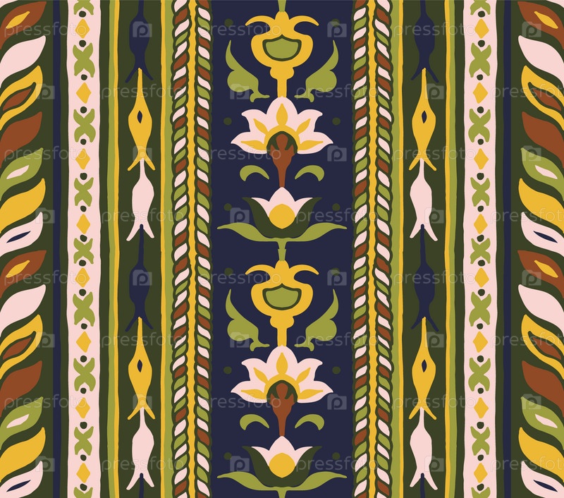 Геометрический дамасский орнамент. Икат границы. Этническая вышивка с листьями и монограммами. Племенная векторная текстура. Бесшовный народный узор в ацтекском стиле. Индийский, скандинавский, цыганский, мексиканский, африканский ковер