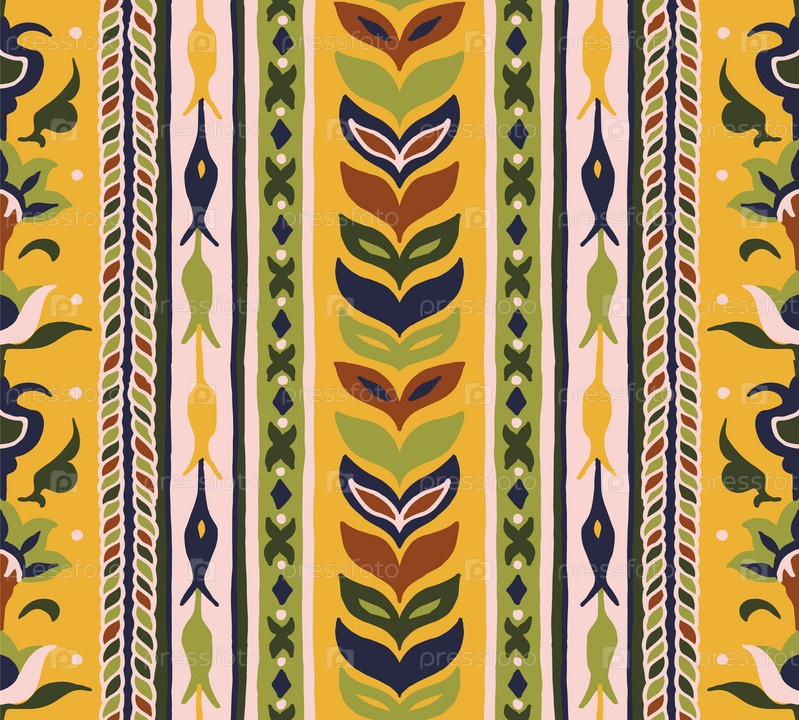 Геометрический дамасский орнамент. Икат границы. Этническая вышивка с листьями и монограммами. Племенная векторная текстура. Бесшовный народный узор в ацтекском стиле. Индийский, скандинавский, цыганский, мексиканский, африканский ковер