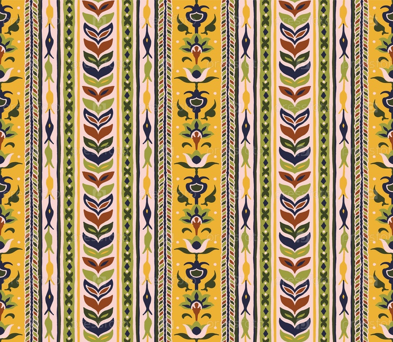 Геометрический дамасский орнамент. Икат границы. Этническая вышивка с листьями и монограммами. Племенная векторная текстура. Бесшовный народный узор в ацтекском стиле. Индийский, скандинавский, цыганский, мексиканский, африканский ковер
