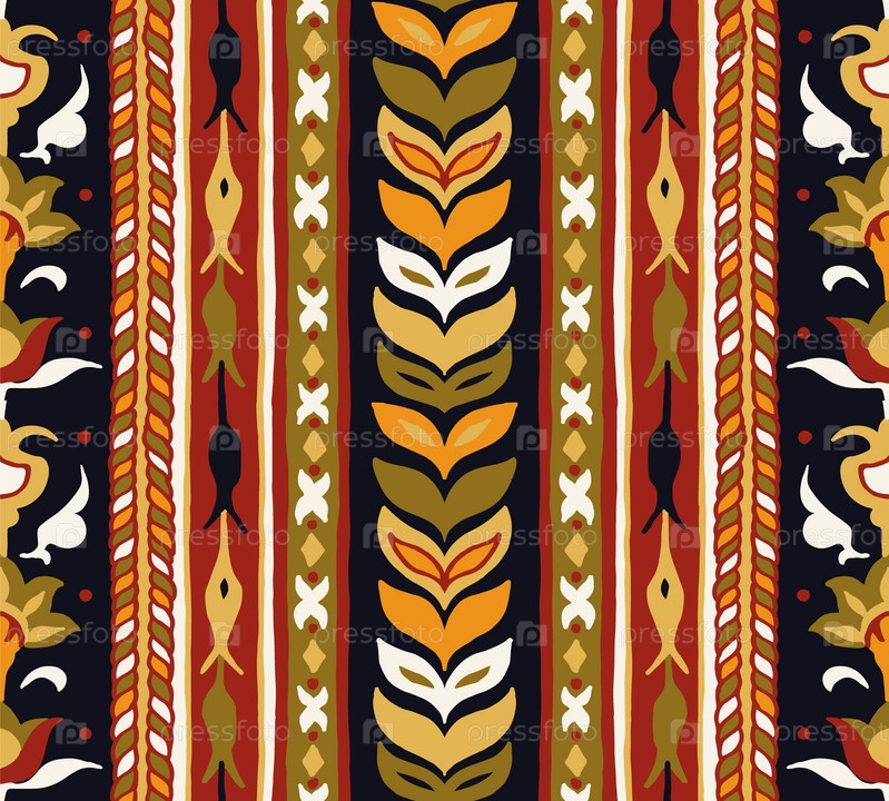 Геометрический дамасский орнамент. Икат границы. Этническая вышивка с листьями и монограммами. Племенная векторная текстура. Бесшовный народный узор в ацтекском стиле. Индийский, скандинавский, цыганский, мексиканский, африканский ковер