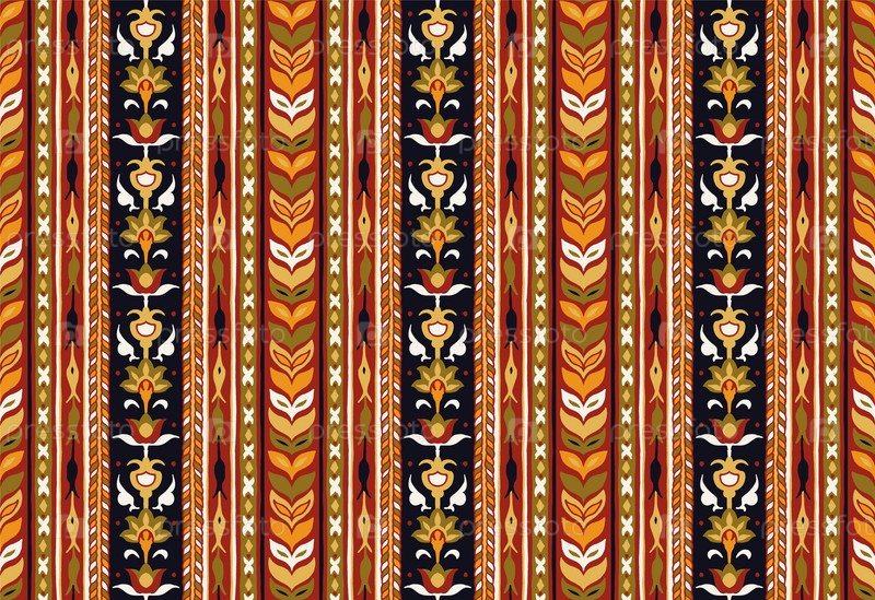 Геометрический дамасский орнамент. Икат границы. Этническая вышивка с листьями и монограммами. Племенная векторная текстура. Бесшовный народный узор в ацтекском стиле. Индийский, скандинавский, цыганский, мексиканский, африканский ковер