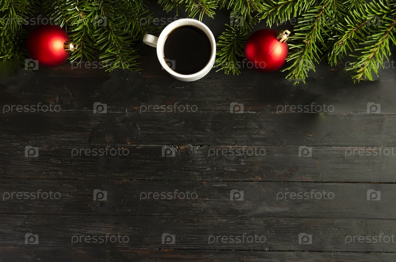 Чашка кофе и новогодний декор на деревянной поверхности, copyspace