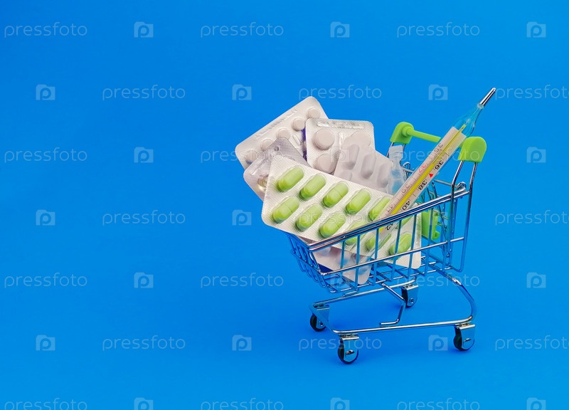 Тележка с таблетками и термометром на синем фоне. Концепция продажи лекарств. Аптека. Место для текста