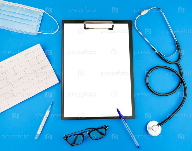 Стол врача со стетоскопом, кардиограммой, термометром и медицинской маской, вид сверху