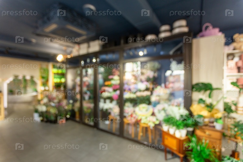 Размытое изображение классического интерьера цветочного магазина с холодильным хранилищем для демонстрации и сохранения цветов