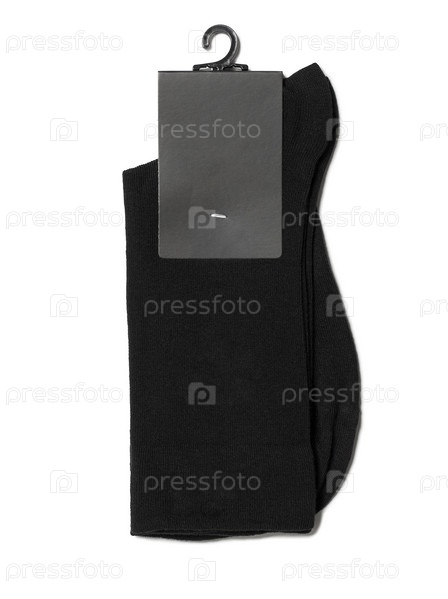 Новые черные носки на белом фоне с чистой черной биркой для вашего дизайна. Макет черных носков с пустой этикеткой. Фото высокого разрешения. Изолированный объект. Вид сверху