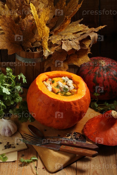 Тыква с мясом и овощами, приготовленная целиком в духовке