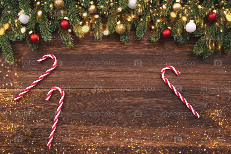 Рождественский деревянный фон, искусственные еловые ветки, декоративные шары и леденцы с блестящими праздничными огнями