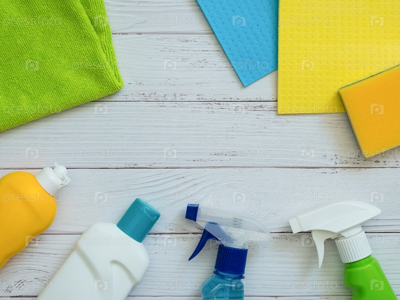 Чистящие средства для дома на белом деревянном фоне с копировальным пространством. Концепция гигиены и чистоты