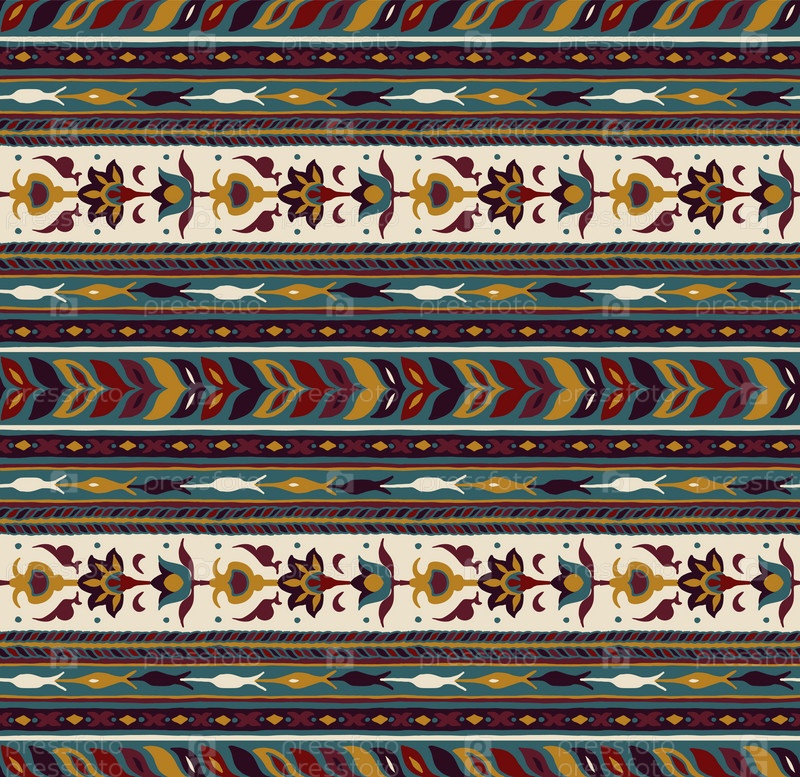 Геометрический фольклорный орнамент икат. Племенная этническая векторная текстура. Бесшовный полосатый узор в стиле ацтеков. Рисунок племенной вышивки. Индийский, скандинавский, цыганский, мексиканский, народный узор