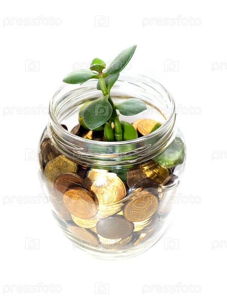 Стеклянная банка, наполненная металлическими монетами и ростком зеленого растения